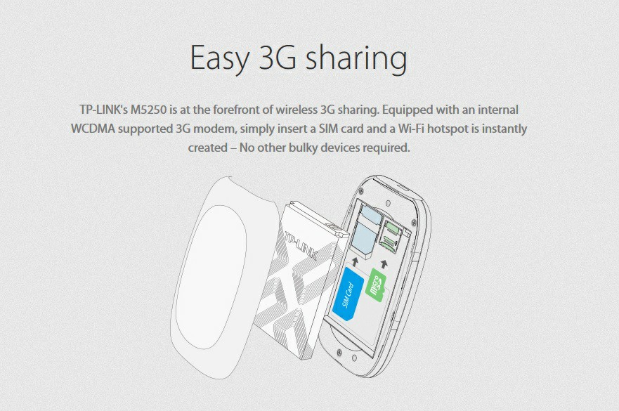| Package Contents | 3G Mobile Wi-Fi M5250 Battery Micro USB Cable Micro to Standard SIM Card Adapter Nano to Standard SIM Card Adapter Quick Installation Guide |